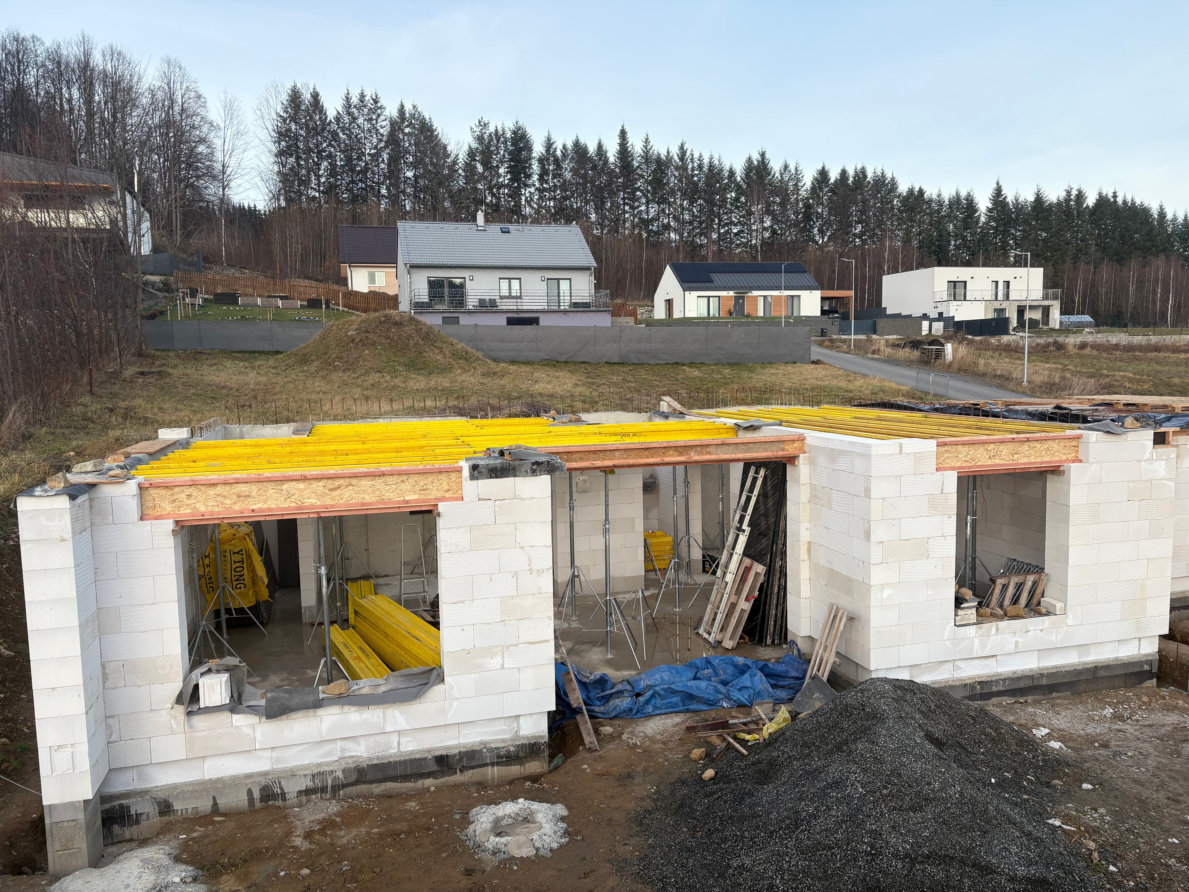 - obvodové stěny v podkroví jsou navrženy z dřevěných CLT panelů, vnitřní nosné stěny a příčky navrženy jako dřevěné sloupkové